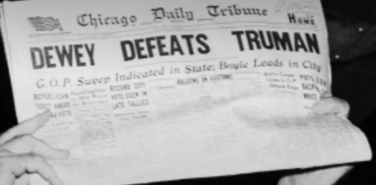 In November 2, 1948, Truman faced a tough election. Almost everyone predicted that his opponent Thomas Dewey would win. One newspaper even printed that Dewey defeats Truman